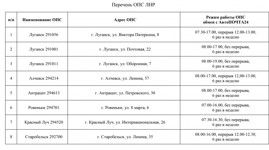 Перечень ОПС Почты ЛНР.
