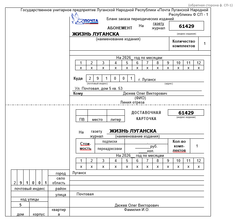 Подписка на периодические издания может быть оформлена с января и последующих месяцев 2025 года, в соответствии с периодичностью выхода из печати издания. Приём и оформление подписки производится в операционных залах Центров почтовой связи, Луганского почтамта, в отделениях почтовой связи, передвижных отделениях почтовой связи, а также почтальонами на доставочных участках по месту работы или проживания клиента.